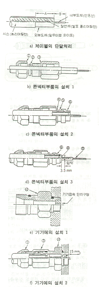 ㉤ 각 부품이 설치된 케이블 끝 부분을 과정 ㉣에서 기기쪽에 붙인 부품번호 ⑩에 스패너로 조여질 때까지 견고하게 조인다. 다시 부품번호 ①을 부품번호 ③에 조여질 때까지 견고하게 조인다.