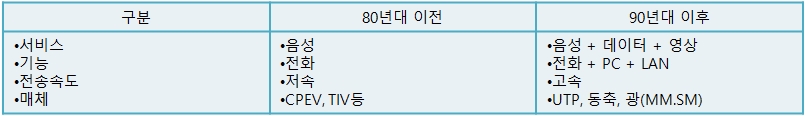 정보화의 가속으로 고속 및 대용량의 전송매체 필요성이 대두되어 아래와 같이 발달되었다.