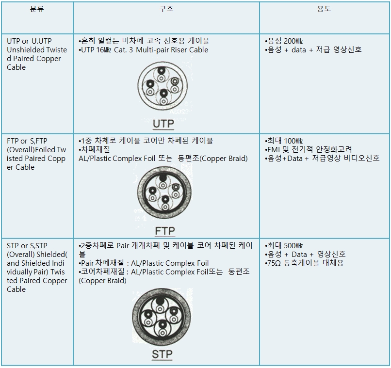 UTP케이블은 차폐의 유무(UTP, FTP, STP), 사용주파수대역(7분류), 난연등급(CNX, CM, CMR, CMP) 으로 분류되고 있다.
