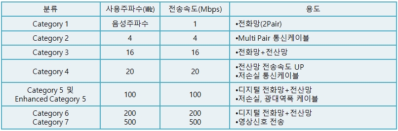현재(1999년) 국내외적으로 상용되는 분류는 Category3, 5, En-cat 5 및 cat.6 이며, Category 4는 Category 5의 등장으로 지금은 소멸되었고, Category 7sms STP구조로서 현재 전세계적으로 개발단계에 있다.