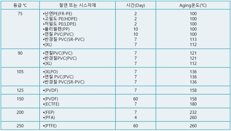 물성등급은 사용되어지는 절연자재 및 시스자재별로 구분되어지는 신뢰성 시험온도(Aging Temperature) 및 시간으로 구분하여 이를 온도(℃)로서 등급화(Rating)하여 분류하고 있다.