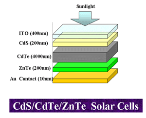 CdTe는 밴드갭이 1.45eV로서 이론적으로 이상적인 값을 갖고 있으며 전기적 및 광학적 특성이 태양전지재료로서 적합한 것으로 알려져 있 으나 무엇보다도 중요한 성질은 물질의 합성이 쉽다는 점이다. 현재까 지 다양한 방법, 즉 근접승화법(Closed-Spaced Sublimation, CSS), 진 공증착법, 전착법, screen printing, spray pyrolysis, metallorganic chemical vapor deposition(MOCVD) 등의 방법이 사용되어 10%이상의 효율이 입증되었다. CdTe층의 합성방법에 상관없이 화학양론비에 맞는 막을 형성하고 CdCl2 용제를 표면에 입힌 후 400oC 정도에서 열처리하 면 대략 10%의 효율을 쉽게 얻을 수 있다고 알려져 있다. CdTe물성에 관한 일반적인 사항은 Zanio에 의해 정리된 바 있다. CdTe전지 기술은 소위 "superstrate" 구조가 제안되고 마지막으로 화학적 용액 성장법으 로 CdS를 입히는 공정이 제안되었을 때 각각 전지의 효율이 획기적으로 증가되었다.