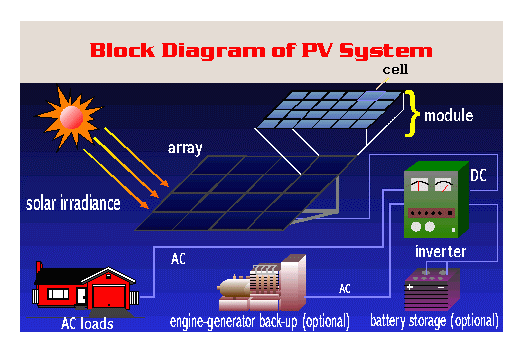 태양전지 집합체와 직류-교류 변환장치(직류출력을 교류로 변환하는 변환장치), 제어장치, 축전지설비로 구성된다.