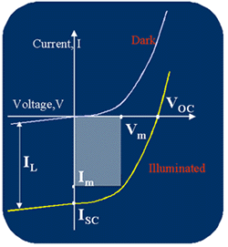 태양전지의 효율을 특징 지워주는 변수로는 open-circuit voltage(Voc), short-circuit current(Jsc), 그리고 fill factor(FF) 등이다. open-circuit voltage(Voc) 는 회로가 개방된 상태, 즉 무한대의 임피던스가 걸린 상태에서 빛을 받았을 때 태양전지의 양단에 형성되는 전위차이다. 동종접합(homojunction) 의 경우를 예로서 설명하자면, 얻을 수 있는 최대한의 Voc값은 p-type 반도체와 n-type 반도체 사이의 일함수 값(work function) 의 차이로 주어지며, 이 값은 반도체의 밴드갭에 의해 결정되므로 밴드갭이 큰 재료를 사용하면 대체로 높은 Voc값이 얻어진다. Short-circuit current(Jsc)는 회로가 단락된 상태, 즉 외부저항이 없는 상태에서 빛을 받았을 때 나타나는 역방향(음의 값) 의 전류밀도 이다. 이 값은 우선적으로 입사광의 세기와 파장분포(spectral distribution)에 따라 달라지지만, 이러한 조건이 결정된 상태에서는 광흡수에 의해 여기된 전자와 정공이 재결합(recombination) 하여 손실되지 않고 얼마나 효과적으로 전지 내부에서 외부회로 쪽으로 보내어지는가에 의존된다. 이 때 재결합에 의한 손실은 재료의 내부에서나 계면에서 일어날 수 있다. 또한 Jsc를 크게 하기 위해선 태양전지 표면에서의 태양 빛의 반사를 최대한으로 감소 시켜야 한다. 이를 위해 Antireflection coating을 해주거나 metal contact을 만들 때 태양 빛을 가리는 면적을 최소화 해주어야 한다. 가능한 모든 파장의 빛을 흡수하기 위해선 반도체의 밴드갭 에너지가 작을수록 유리하지만 그렇게 되면 Voc도 감소하게 되므로 적정한 밴드갭을 가진 재료가 필요하다. 따라서 최대크기의 Voc와Jsc값을 얻기 위해 계산된 이론적인 최적의 밴드갭 에너지는 1.4eV가 된다. Fill factor(FF) 는 최대전력점에서의 전류밀도와 전압값의 곱(Vmp×Jmp) 을 Voc와Jsc의 곱으로 나눈 값이다. 따라서 fill factor는 빛이 가해진 상태에서 J-V곡선의 모양이 사각형에 얼마나 가까운가를 나타내는 지표이다. 태양전지의 효율 η은 전지에 의해 생산된 최대 전력과 입사광 에너지 Pin 사이의 비율이다.