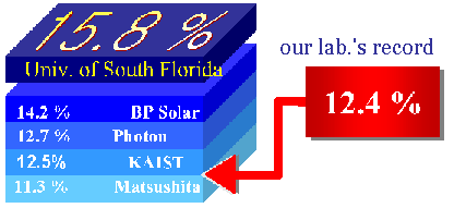 비정질 실리콘 태양전지(a-Si) 는 가장 상업적으로 성공한 최초의 박막 형태의 태양전지이다. 그러나, 이 태양전지는 아직은 1980년대부터 예 상되어왔던 만큼의 효율은 현재 보이지 않고 있다. 그 이유는 빛을 받 을 때 a-Si이 상당히 intrinsic degradation 되기 때문이다. 빛을 쪼 여줄 때 발생하는 intrinsic degradation은 약 20%정도로 제한될 수 있다. 따라서 재료의 가공기술과 디바이스 디자인을 얼마나 발전시키는 가 가 a-Si의 효율을 안정화 시키는 관건이 된다. 다중접합 (multijunction) 을 이용하는 디바이스(복합셀 내에서 더욱더 얇은 흡 수층을 가능케 한다.) 와 빛을 잡아두는 방식은 안정된 효율의 태양전 지를 제작하게 할 수 있다. 현재 이런 방법으로 비정질 실리콘 태양전 지의 효율은 약 12%이상 그리고 모듈(module, 1평방 피트) 로서는 10% 이상의 고효율을 기록하고 있다.