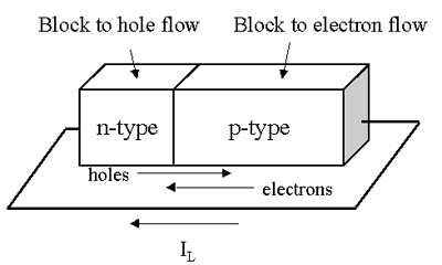 대부분 보통의 태양전지는 대면적의 p-n 접합 다이오드(p-n junction diode)로 이루어져 있다. 광전 에너지 변환(photovoltaic energy conversion)을 위해 태양전지가 기본적으로 갖춰야 하는 요건은 반도체 구조 내에서 전자들이 비 대칭적으로 존재해야 한다는 것이다. 그림1은 p-n 접합의 비 대칭성을 나타낸 것이다. n-type 지역은 큰 전자밀도 (electron density)와 작은 정공밀도(hole density) 를 가지고 있고 p-type 지역은 그와 정반대로 되어있다. 따라서 열적 평형상태에서 p-type반도체와 n-type반도체의 접합으로 이루어진 다이오드에서는 캐 리어(carrier)의 농도 구배에 의한 확산으로 전하(charge) 의 불균형이 생기고 이 때문에 전기장(electric field)이 형성되어 더 이상 carrier 의 확산이 일어나지 않게 된다. 이 다이오드에 그 물질의 전도대 (conduction band) 와 가전자대(valence band) 사이의 에너지 차이인 밴드갭 에너지(band gap energy) 이상의 빛을 가했을 경우, 이 빛 에너 지를 받아서 전자들은 가전자대에서 전도대로 여기(excite) 된다. 이때 전도대로 여기된 전자들은 자유롭게 이동할 수 있게 되며, 가전자대에는 전자들이 빠져나간 자리에 정공이 생성된다. 이것을 excess carrier라 고 하며 이 excess carrier들은 전도대 또는 가전자대 내에서 농도차이 에 의해서 확산하게 된다. 이때 p-type반도체에서 여기된 전자들과 n-type반도체에서 만들어진 정공을 각각의 minority carrier라고 부르 며, 기존 접합전의 p-type또는 n-type반도체내의 carrier(p-type의 정 공, n-type의 전자) 는 이와 구분해 majority carrier라고 부른다. 이 때 majority carrier들은 전기장으로 생긴energy barrier 때문에 흐름 의 방해를 받지만 p-type의 minority carrier인 전자는 n-type쪽으로 각각 이동할 수 있다. Minority carrier의 확산에 의해 재료 내부의 charge neutrality가 깨짐으로써 전압차(potential drop)가 생기고 이 때 p-n접합 다이오드의 양극단에 발생된 기전력을 외부 회로에 연결하면 태양전지로서 작용하게 된다.