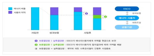 · 시설투자의 소요자금은 에너지사용자(고객)가 조달(자체자금, 정책자금 등)하고, 시설투자에 의한 절감액을 에너지절약전문기업이 에너지사용자에게 보증하며 투자시설에 대해 사후관리 실시