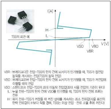 TSS(Thyristor Surge Suppressors)는 자기 온 타입 사이리스터의 일종으로 동작 정지 전류(유지 전류)를 크게 한 것이다. 전화 관련 기기의 뇌보호 대책이 이용되는 SPD의 주요 구성 부품 중 하나이다. TSS는 규정 전압치를 초월한 뇌서지가 인가되면 즉시 클리핑 동작을 개시하고, 순식간에 전압이 켜진 상태가 됨으로써 과전압을 억제하여 뇌서지를 분류하는 특성을 갖고 있다. 저전압 온 상태에 스위칭 동작하는 특성이 있기 때문에 소형이면서 비교적 큰 임펄스 전류 내량을 확보할 수 있는 반면, 뇌서지가 사라진 후에도 온 상태를 유지하는 속류 현상에 주의해야 한다. 그림 9에 TSS의 전압-전류 특성 예를 나타냈다.