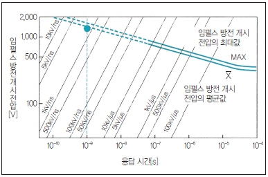b. 임펄스 방전 개시 전압 : GDT의 양 단자에 충분히 높은 임펄스 전압을 인가했을 때, GDT가 방전을 개시하는 단자 간의 전압이다. 그림6은 직류 방전 개시 전압이 400V인 GDT에 각 준도의 임펄스 전압을 인가했을 때의 전압-시간 특성 예이다. 그림에서 임펄스 전압의 준도가 급격해지면 임펄스 방전 개시 전압도 높아지는 것을 알수 있다.