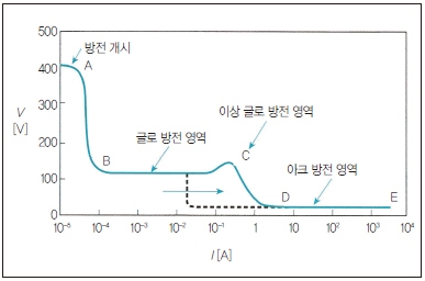 전류를 더욱 증가시키면 이상 글로 방전 영역(그림 8 C 참조)을 거쳐 아크 방전 영역(그림 8 D-E 참조)이 되고, 10~20V의 저전압에서 방전을 계속한다. GDT가 아크 방전 영역으로 이동한 후, 통전시키는 전류를 줄이면 다시 글로 방전 영역으로 복귀, 마침내 방전을 유지할 수 없게되어 방전 정지된다. 그림 8에서 방전 경과를 나타내면 A(방전 개시)→B→C→D→E→D→F→G→B→A(방전 정지)가 된다.