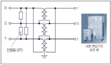 전원용에 대해서는 1차권선과 2차권선 간에 정전 차폐를 설치해 접지함으로써 서지 이행률을 1/1000이하로 낮춘다. 전원용 내뢰 변압기(삼상용)의 회로 예를 그림 10에 나타냈다.