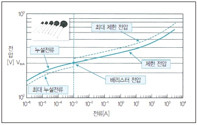 MOV의 전압-전류 특성은 그림 1에 나타낸 바와 같이 실선으로 나타낸 오른쪽으로 올라간 곡선을 그리고 있다. 일반적으로 MOV에 1mA의 전류를 통전시켰을 때의 전압을 배리스터 전압이라고 한다.