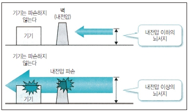 전기·전자기기는 뇌서지에 대한 내전압을 갖고 있으며, 내전압 이상의 뇌서지가 인가되면 기기는 파손된다(그림 3 참조). 뇌보호 대책을 하는 경우, 피보호 기기에 인가되는 뇌서지를 내전압 이하로 할 필요가 있다.