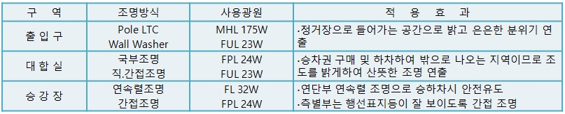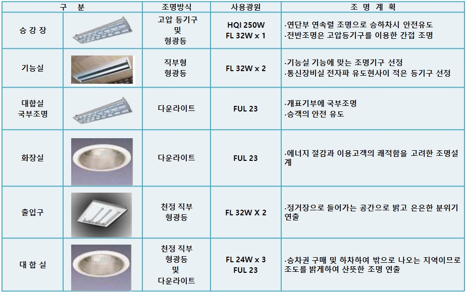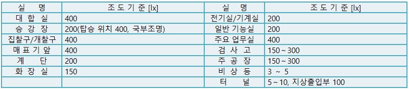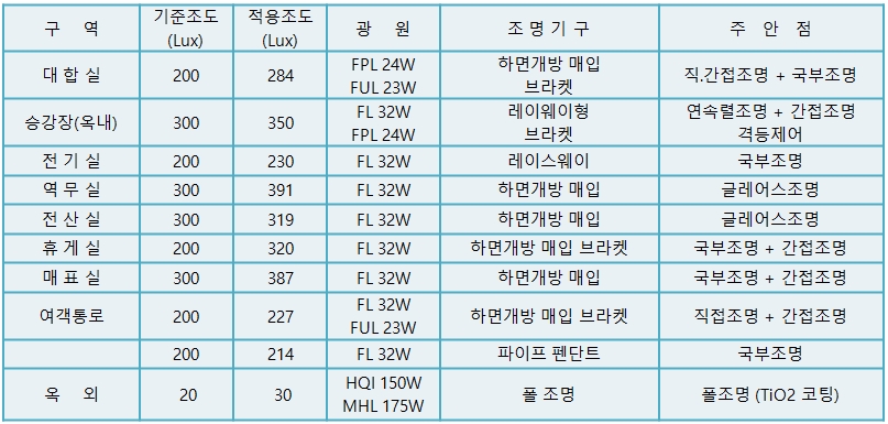 •조도기준은 승객의 이용 및 기능상에 적합한 조도를 유지하면서 KSA 3011과 전철자료를 참고 하여 각 역사와 기능실별 조도 기준을 선정