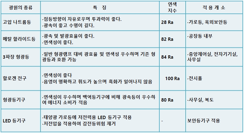 - 전구, 형광등의 빛은 수명기간동안 계속 감소 ⇒ 형광등은 초기보다 25~30% 감소
