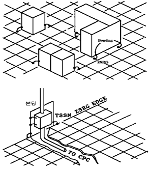 빌딩에 있어서 특히 컴퓨터의 접지에는 충분히 유의할 필요가 있다. 컴퓨터 접지로서 컴퓨터 전원설비의 접지는 본래부터 컴퓨터와의 정상적인 동작을 확보하기 위해, 기기 접지, 라인필터용 접지, 신호용 접지 등의 독특한 접지가 시행되고 있다. 사용되는 주파수도 고주파이므로, 접지시스템도 접지 임피던스로 고려하지 않으면 안된다. 이에 덧붙여, 고층빌딩 등에서 각 층마다 컴퓨터 등의 OA기기를 설치하고 있는 경우 이러한 것들의 접지선 부설형태의 문제도 있다. 여기서 생각할 수 있는 것이 ZSRG(Zero Signal Reference Grid)를 사용하는 접지시스템으로, 전위의 안정된 기준점을 설정하는 기준접지의 개념을 적용한 것이다(그림 2.5). 모든 접지를 접지 기준점에 본딩(bonding)하는 것이 이 시스템의 핵심이다. 다시 말하면 빌딩의 각층 바닥에 기준접지극을 설치하여 빌딩자체를 전기적 케이지로 간주하는 것으로, 철근이나 철골의 접속부가 완전하여 고주파 영역에서도 저임피던스인 경우에는 이에 본딩해서 접지선으로서 대용한다. 이외의 경우에는 각 계단 바닥의 접지선을 전용선으로 각각 대지에 시공한 접지전극에 시설하는 방법을 생각할 수 있다.