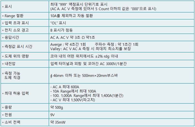 ◦ 500A를 넘는 대전류 측정 시는 코아부에 발열이 생기므로 단시간에 측정할 것