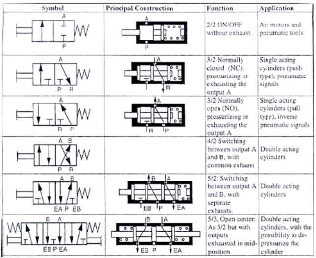 1) 5/2 valve • 2개 실린더 포트(A,B), 2개 배기 포트 (E1, E2), 1개 압축공기 포트(IN) • 동작 두 개:(IN→A, B→E2), (IN→B, A→E1) • 복동 실린더 구동에 적합