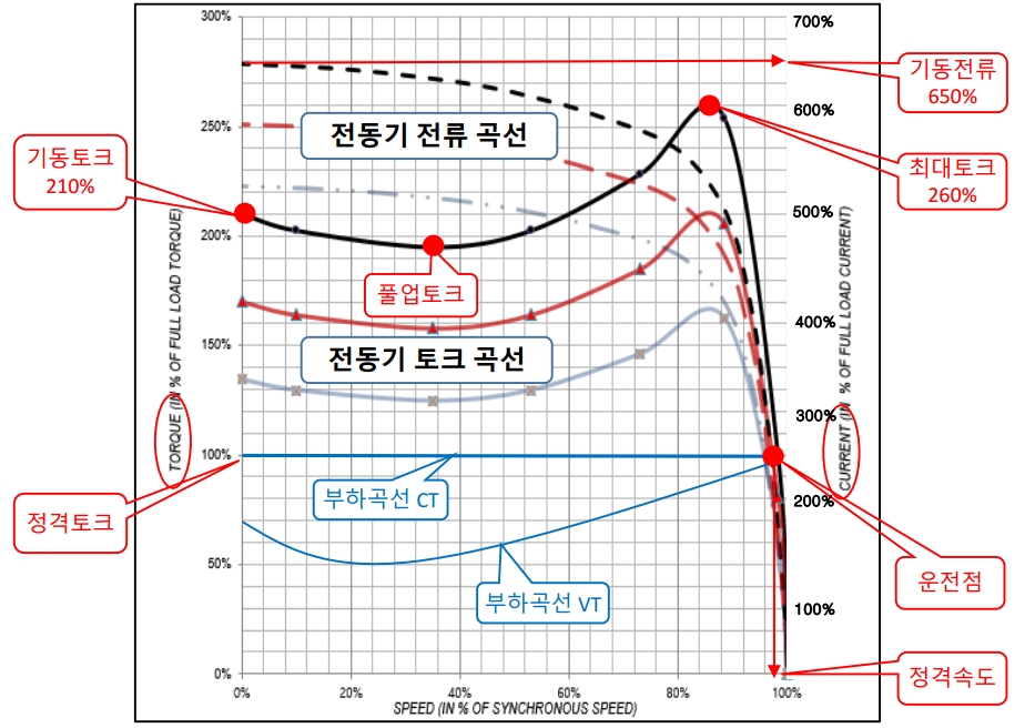 · 기동 전 과정에서의 전동기 곡선이 부하 곡선보다 커야 기동에 문제가 없습니다.