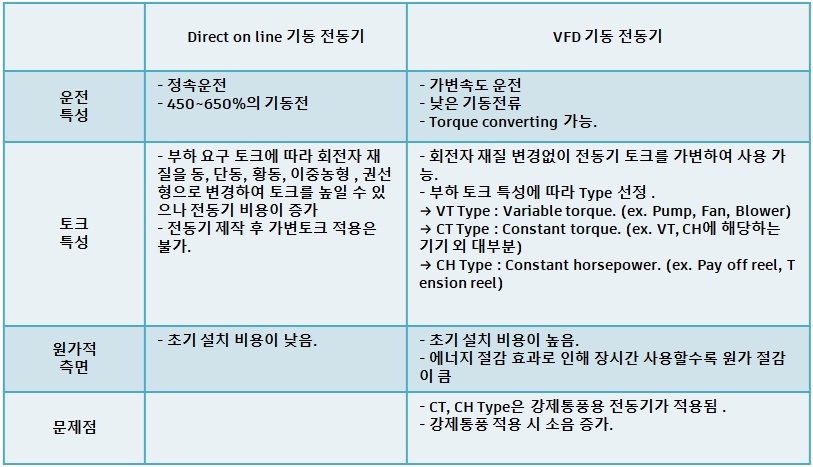 부하기기의 속도 및 토크 제어, 전력 저감을 위해서 사용하며, 부하기기의 토크 특성에 따라 VT, CT, CH 방식을 적용.
