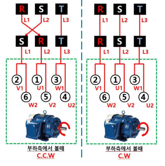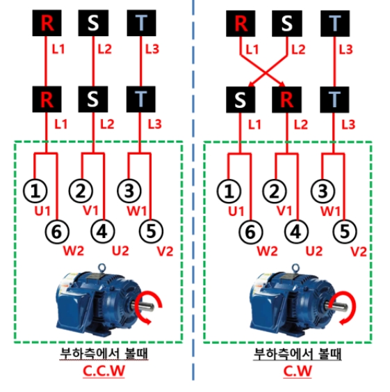 - 3상유도전동기는 전원인입선의 2개의 상을 교차 시키면 전동기의 축의 회전방향이 반대로 됩니다.