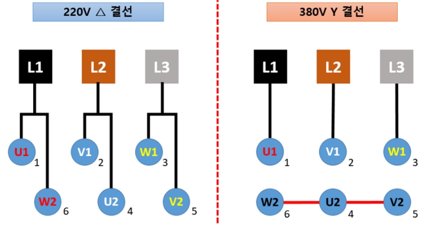 - 6가닥의 리드선을 인가되는 전압(낮은전압(220V), 높은전압(380V)) 에 맞게 결선합니다.