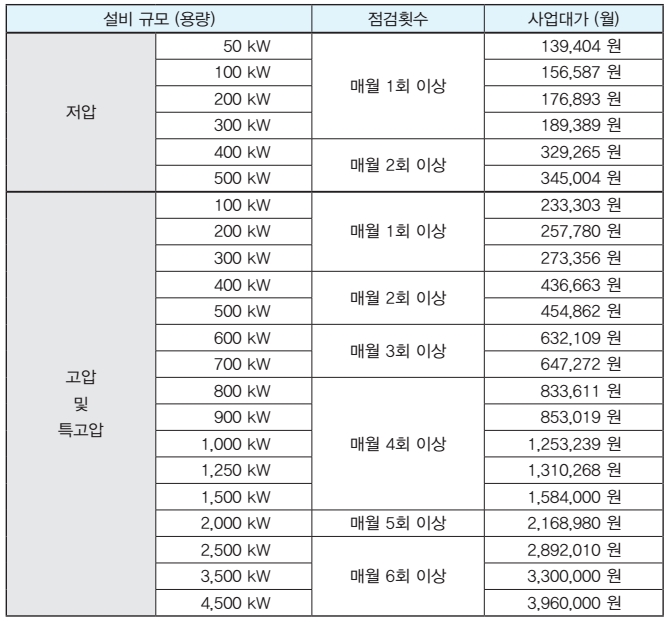 1) 해당 기준표는 산업부의 2023년도 전기설비 엔지니어링 표준품셈(부록)에 포함된 전기안전관리대행 설비 규모별 사업대가 예시입니다.